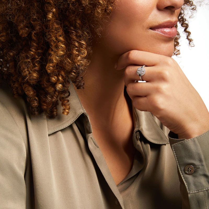 This beautiful ring for her showcases an elegant emerald-cut aquamarine at the center, surrounded by sparkling frames of round and baguette-cut white sapphires. Gorgeous pear-shaped London Blue topaz gemstones flank each side, and more round-cut white sapphires shimmer down the band to finish the look. The ring is crafted in classic sterling silver.