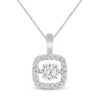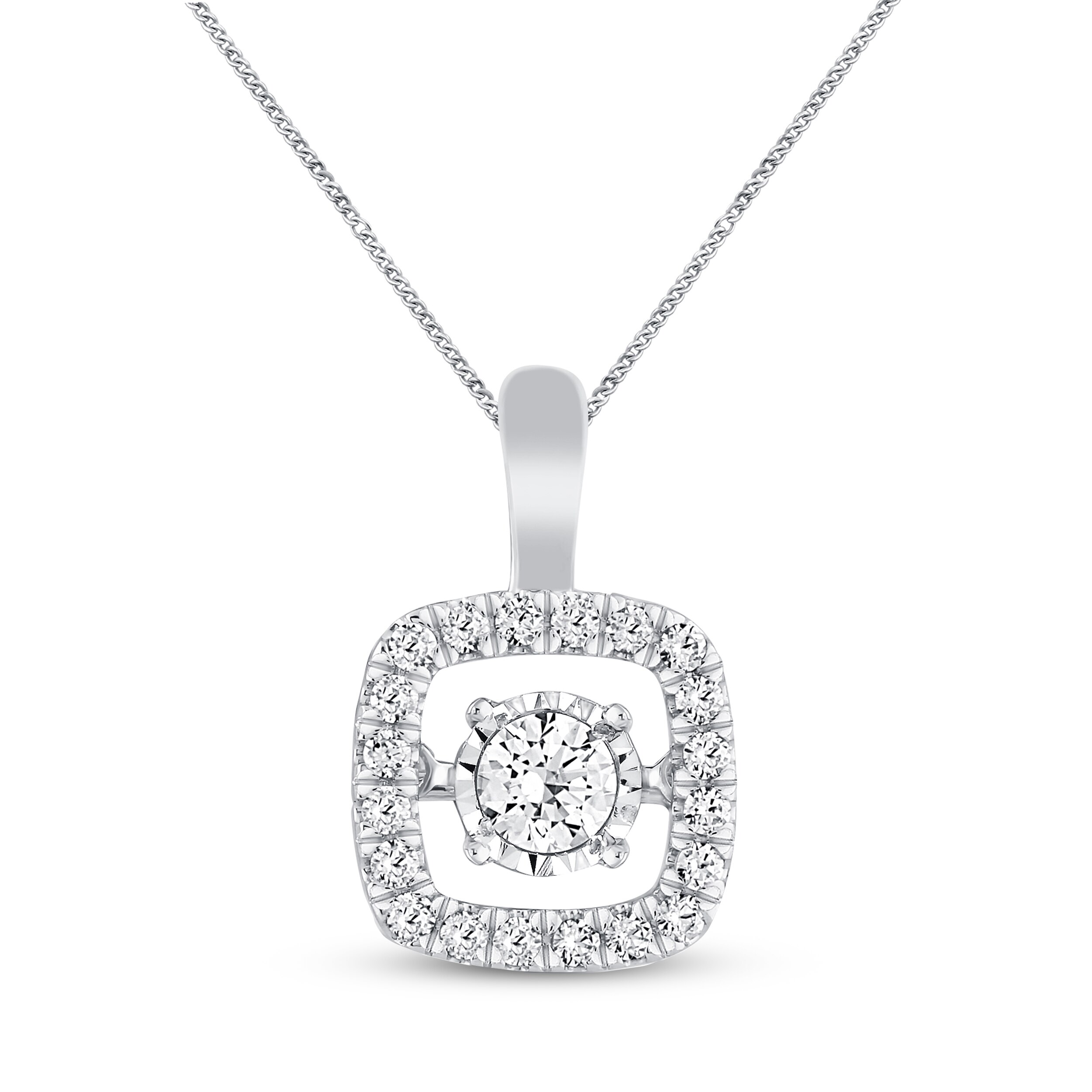 This stunning diamond necklace for her features a twinkling, square-shaped frame of round diamonds and a beautiful round diamond in the center that moves, catching light from every angle. The 10K white gold necklace shines with a total diamond weight of 1/2 carat. The pendant rests on a 19-inch curb chain that secures with a trigger clasp.